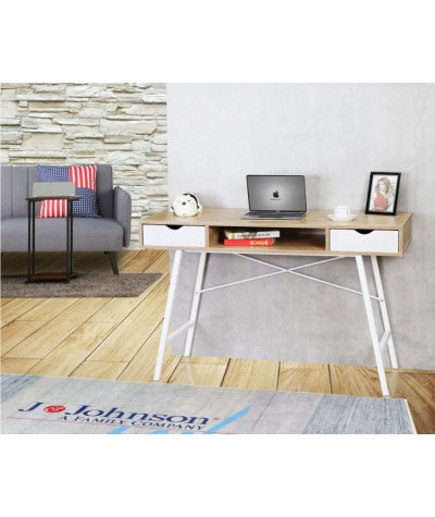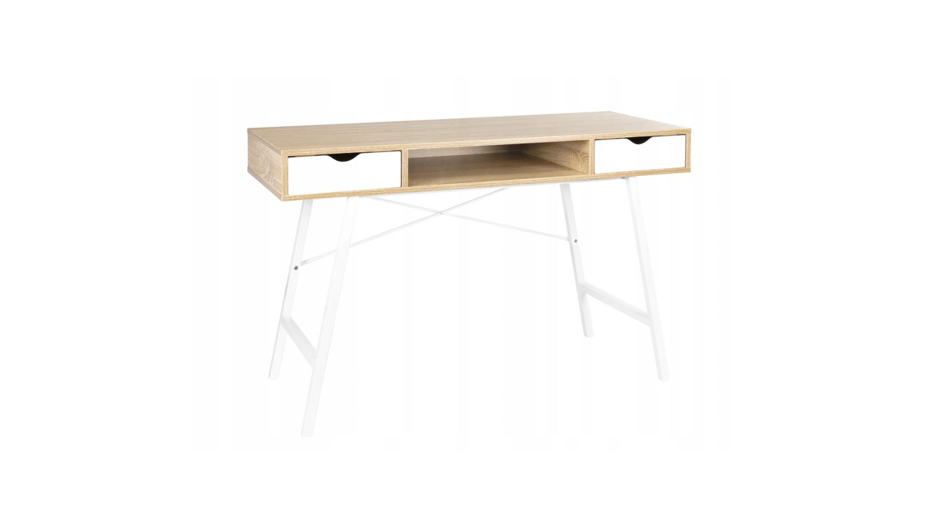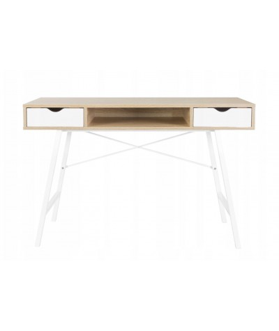 Nowoczesne biurko w skandynawskim stylu z dwoma wysuwanymi szufladami oraz podręczną półką tuż pod blatem. Jest to idealne rozwiązanie zwłaszcza dla domowych biur i pracowni. Kształt i kolorystyka biurka dodadzą uroku każdemu wnętrzu.